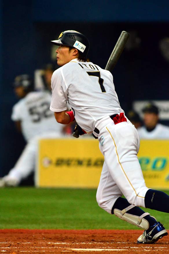 3番 糸井 中安 センターへのヒットを放つ 1,2塁 |