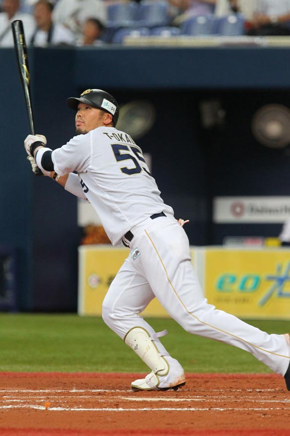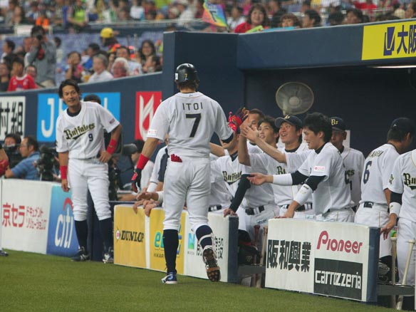 3番 糸井 右犠飛 ランナー2,3塁からライトへの犠牲フライを放つ オ5-1ロ 2アウト3塁 ![]() 5