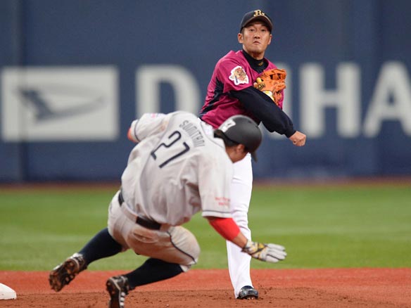 一塁走者糸井:すかさず初球から盗塁を試みるもアウト 3アウトチェンジ |