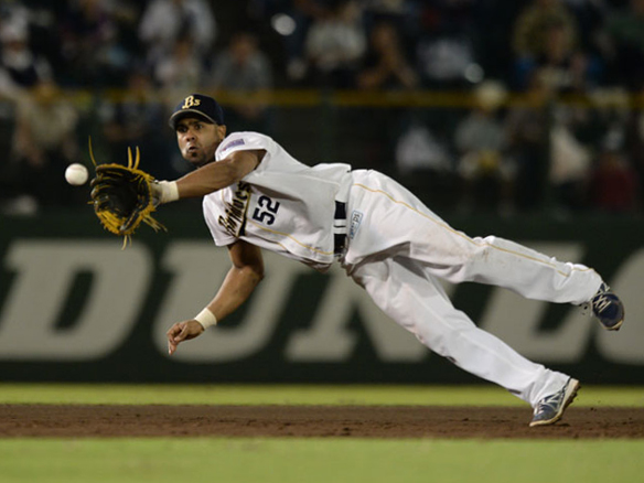 5番 バルディリス 右翼二 ランナー2塁の3-2からライトへタイムリーツーベース! オ9-6西 2塁 ![]() 9