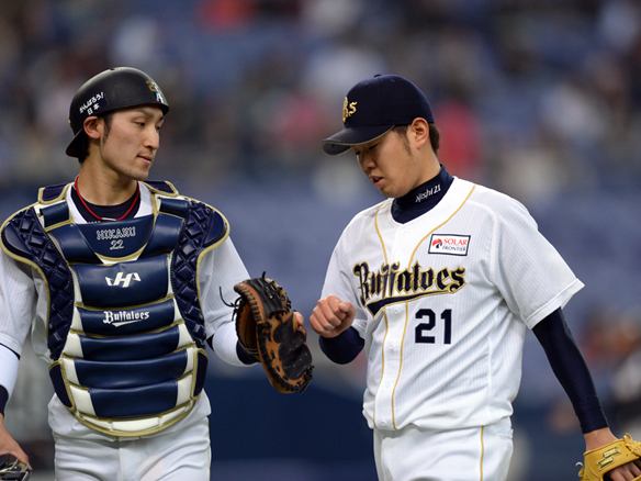 連続三振を奪いベンチへ戻る西投手と伊藤選手