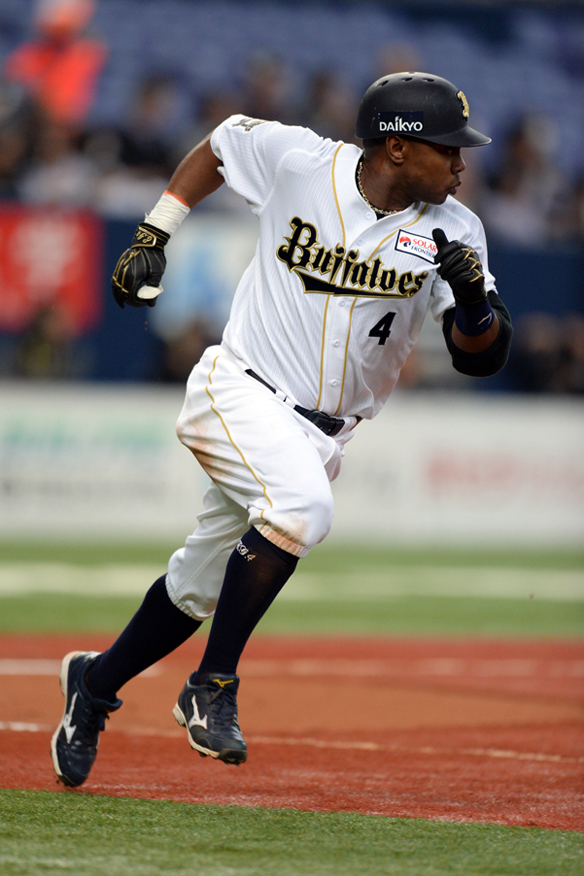 1番 ヘルマン 左安 レフトへのヒットを放つ 1,2塁 |