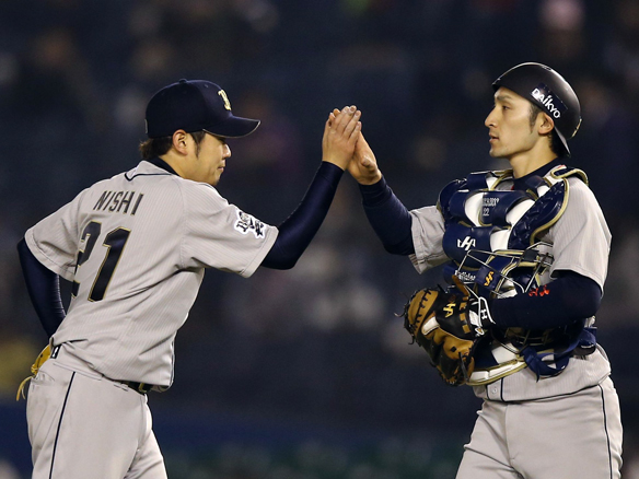 併殺を完成させた野手陣を称える西投手