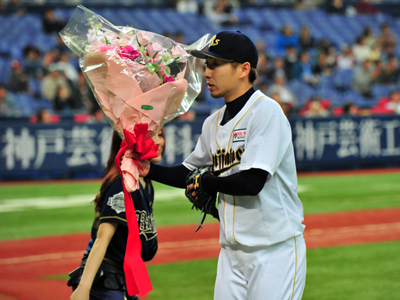 1000奪三振を達成し花束をもらう金子千尋投手