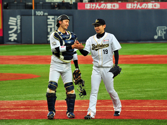 伊藤選手と笑顔でタッチを交わす金子千尋投手