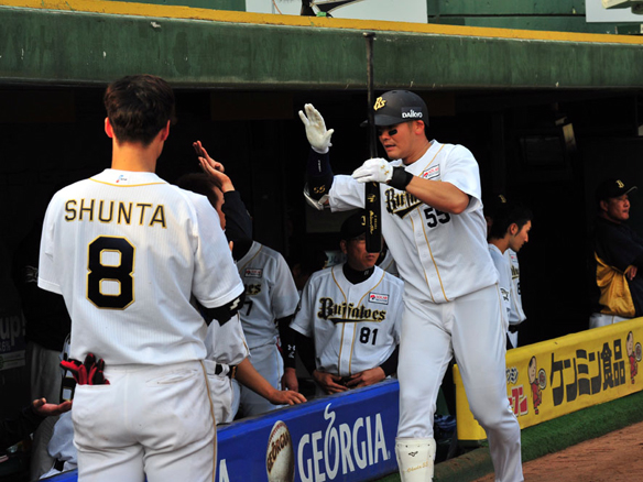 2号ソロを放ち祝福を受けるT-岡田選手