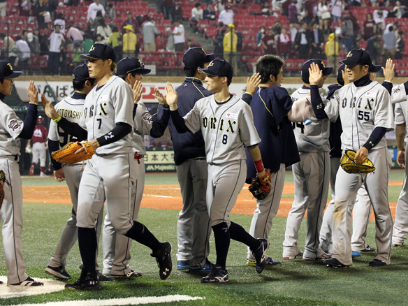 対イーグルス戦8連勝を飾りハイタッチを交わすBsナイン!!