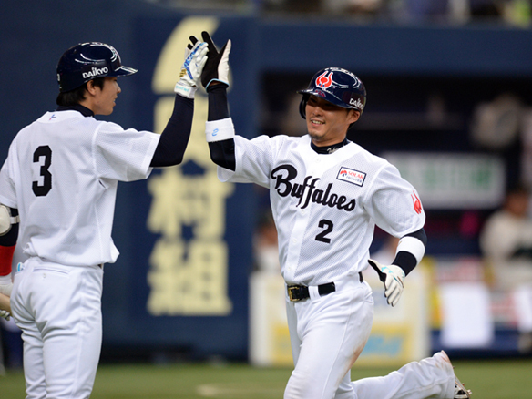 ホームに生還し安達選手とタッチを交わす原拓選手