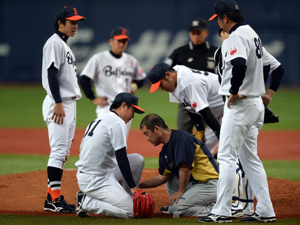 打球が直撃した松葉投手が治療を受ける