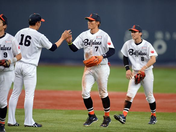 最後を締めた平野佳投手が糸井選手とタッチを交わす