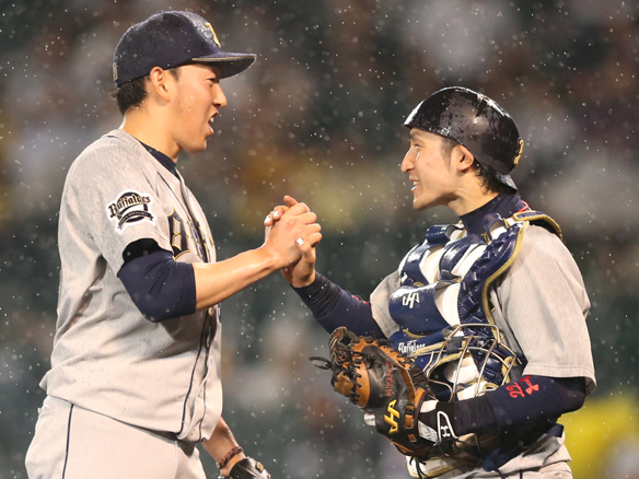 勝利を分かち合う平野佳投手と伊藤選手