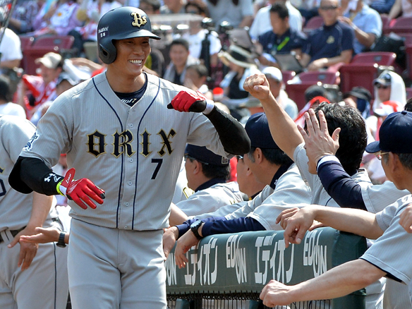 ホームランを放った糸井選手はベンチと笑顔でハイタッチ