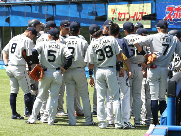 反撃を見せたいバファローズナインは攻撃前に円陣を組む