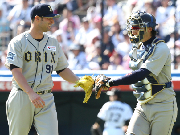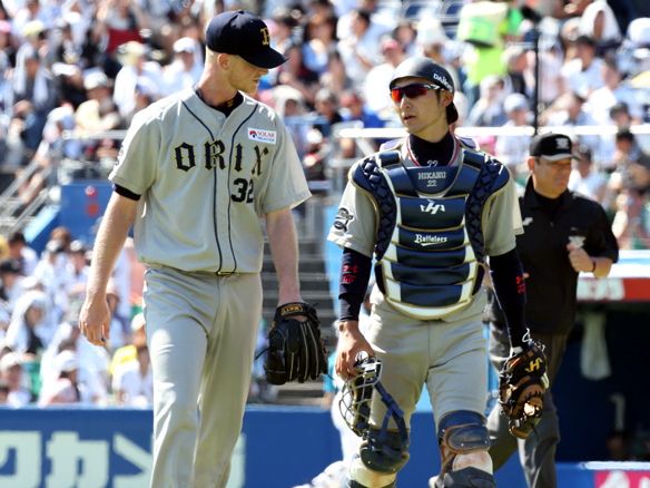 好投を見せたマエストリ投手は伊藤捕手とタッチ