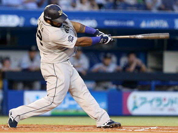 4番 ペーニャ 左安 2アウト3塁の1-1から先制のタイムリーヒット! ロ0-1オ 1塁 ![]() 0