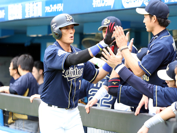 自己最多となる18号ソロを放った糸井選手がタッチを交わす