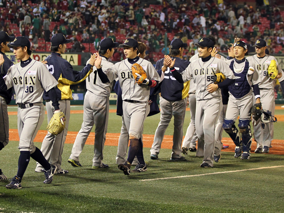 完封勝利を挙げハイタッチを交わすBsナイン!!