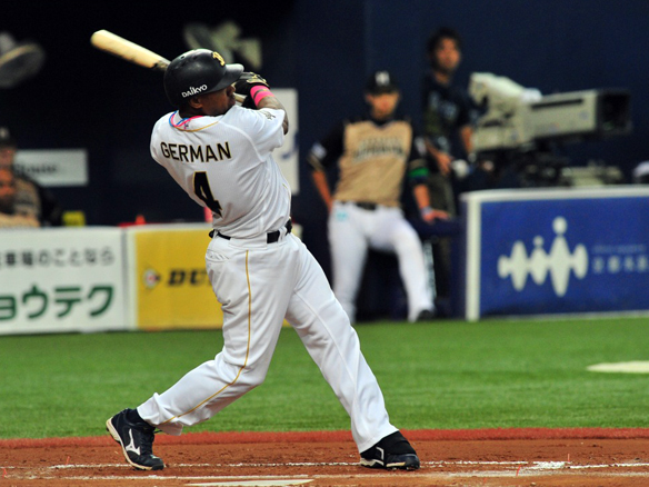 投手 クロッタ 7番 ヘルマン 左中二 2アウト2,3塁からレフトへの同点タイムリーツーベース! オ3-3日 2塁 ![]() 3