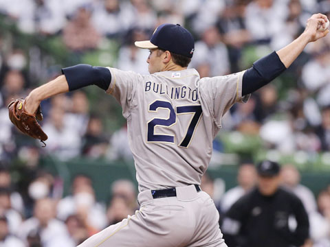 投手 バリントン 5番 メヒア 遊ゴ ど真ん中の真っ直ぐを打つもショートゴロ 1アウト |