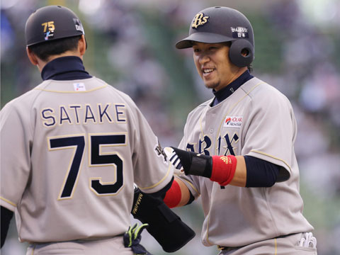 安打を放ち、佐竹コーチとタッチを交わす中島選手