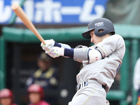投手 金刃 2番 平野恵 左安 レフトへのヒットを放つ 1塁  |