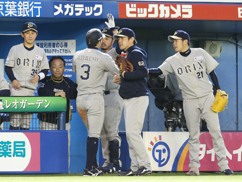 カラバイヨ選手の右犠飛で生還した安達選手(中央)を出迎えるオリックスナイン