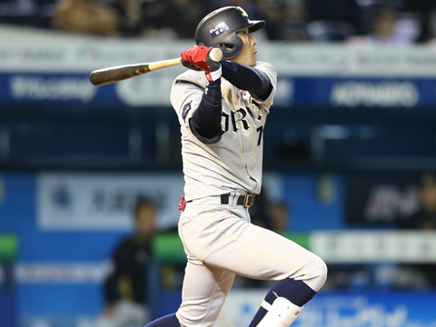 1番 平野恵 右安 ライトへのヒットを放つ 1塁 |