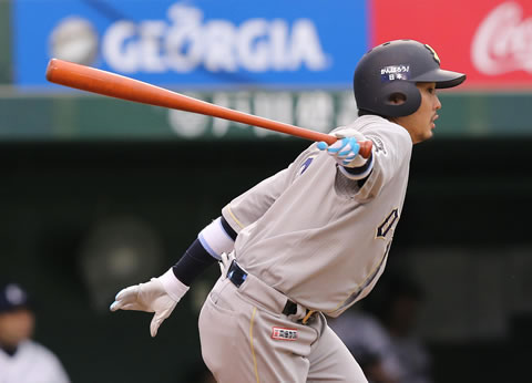 5番 カラバイヨ 四球 一度もバットを振ることなくストレートのフォアボールを選ぶ 1塁 |