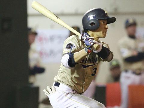 3番 柳田 右安 ライトへのヒットを放つ 1,2塁 |