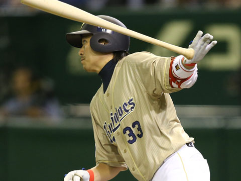 投手 東明 1番 立岡 左安 レフトへのヒットを放つ 1塁 |