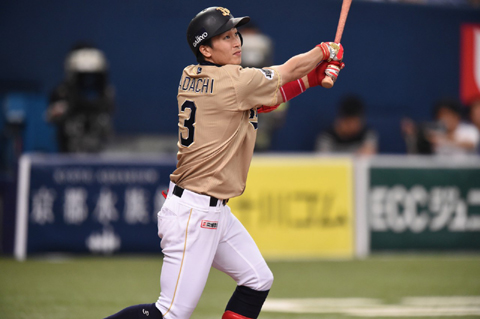 投手 島本 5番 T-岡田 左安 レフトへのヒットを放つ 1塁 |