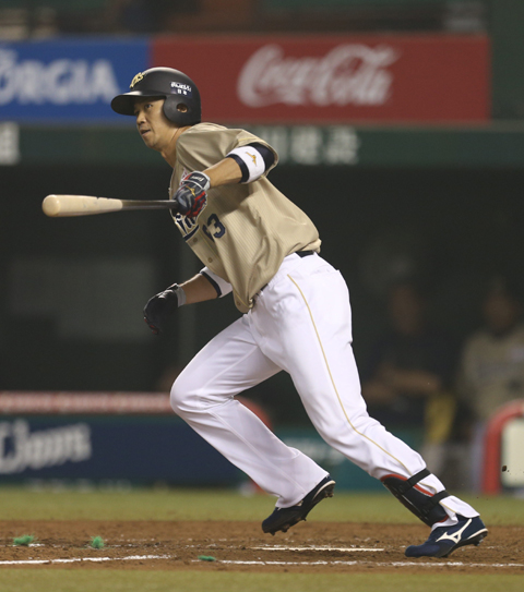 6番 脇谷 中安 センターへのヒットを放つ 1塁 |