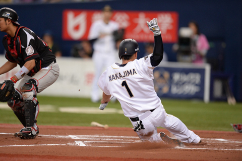 二塁打で好機を演出した中島選手が、宮崎選手の適時打で生還!!