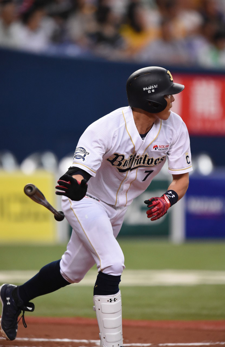投手 岸田 1番 明石 右安 ランナーフルベースの2-2からライトへの勝ち越しタイムリーヒット! オ1-2ソ 満塁 ![]() 1