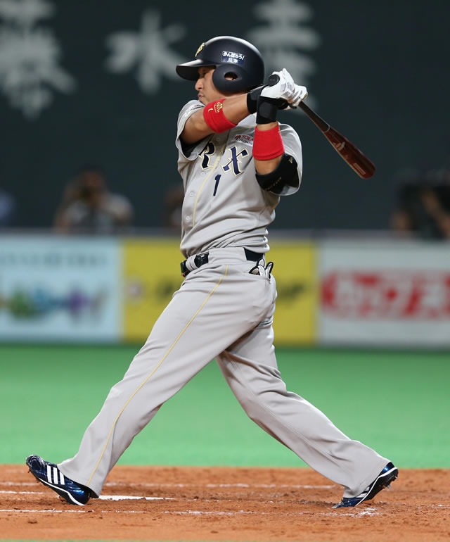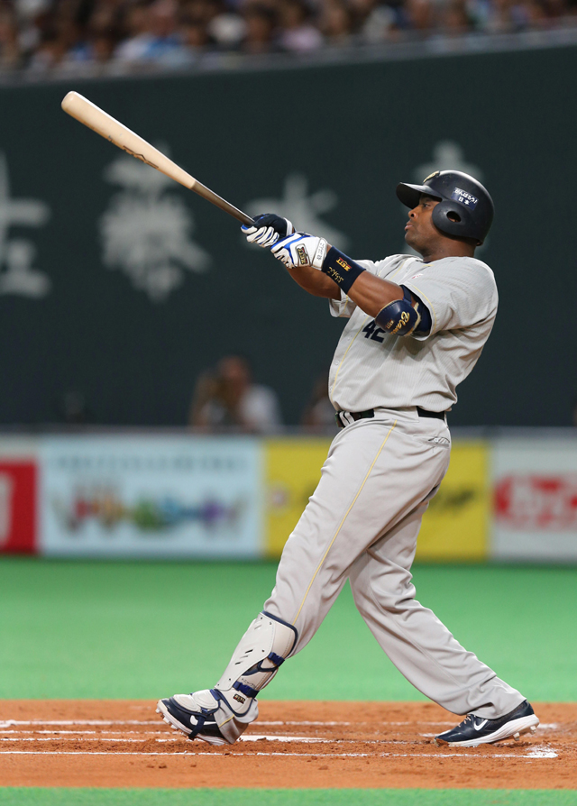 6番 レアード 四球 一度もバットを振ることなくフォアボールを選ぶ 1塁 |
