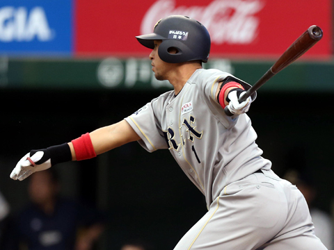 左前打を放つヘルマン選手