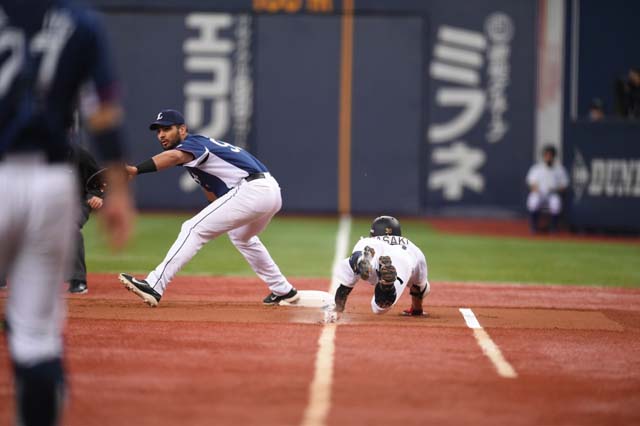 岩崎選手が気迫のヘッドスライディングで内野安打をもぎ取る!!