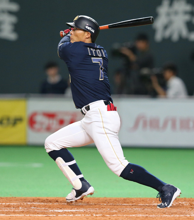 3番 糸井 左中二 センターへのツーベース 2塁 |