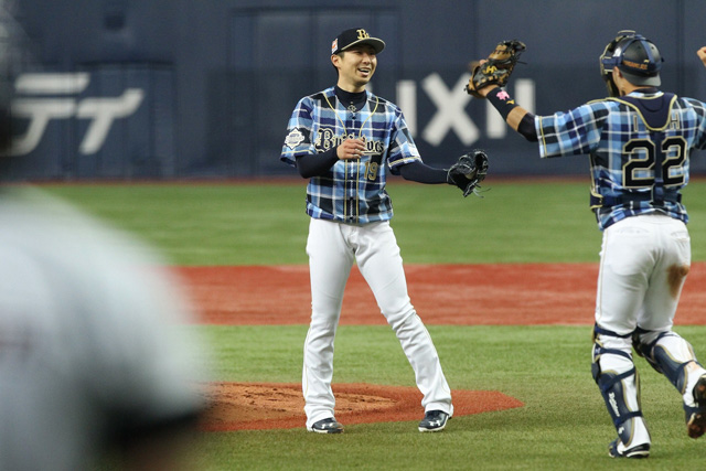 E打線を見事に封じ込めた金子千尋投手と伊藤捕手