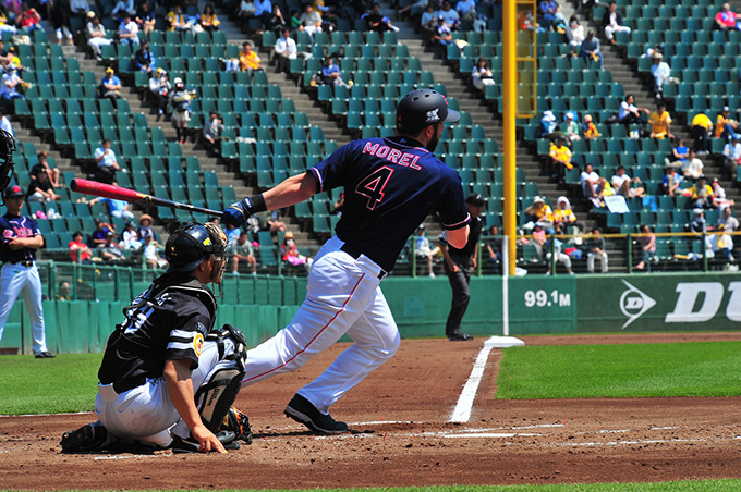 モレル選手は中前打を放ち出塁する