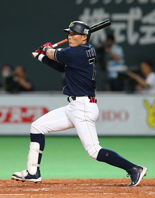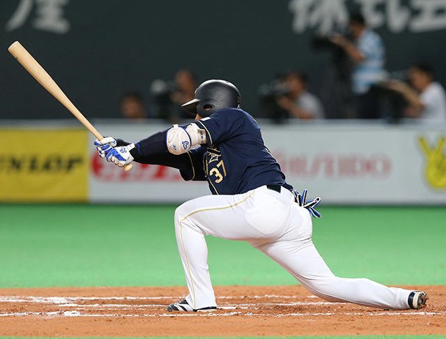 3番 糸井 左翼二 カウント2-2からレフトへのタイムリーツーベースでオリックス先制! 日0-1オ 2塁 ![]() 0