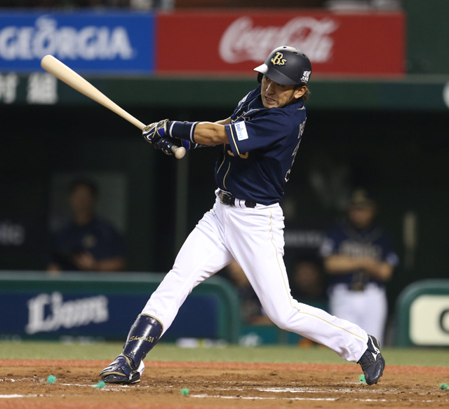 6番 栗山 中安 ランナー1塁 外角のストレートをセンターへ打ってヒット |