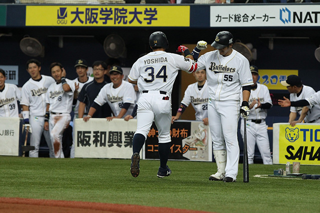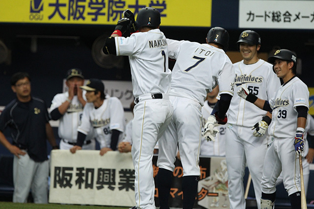 先制3ランHRを放った中島選手と出迎える糸井選手