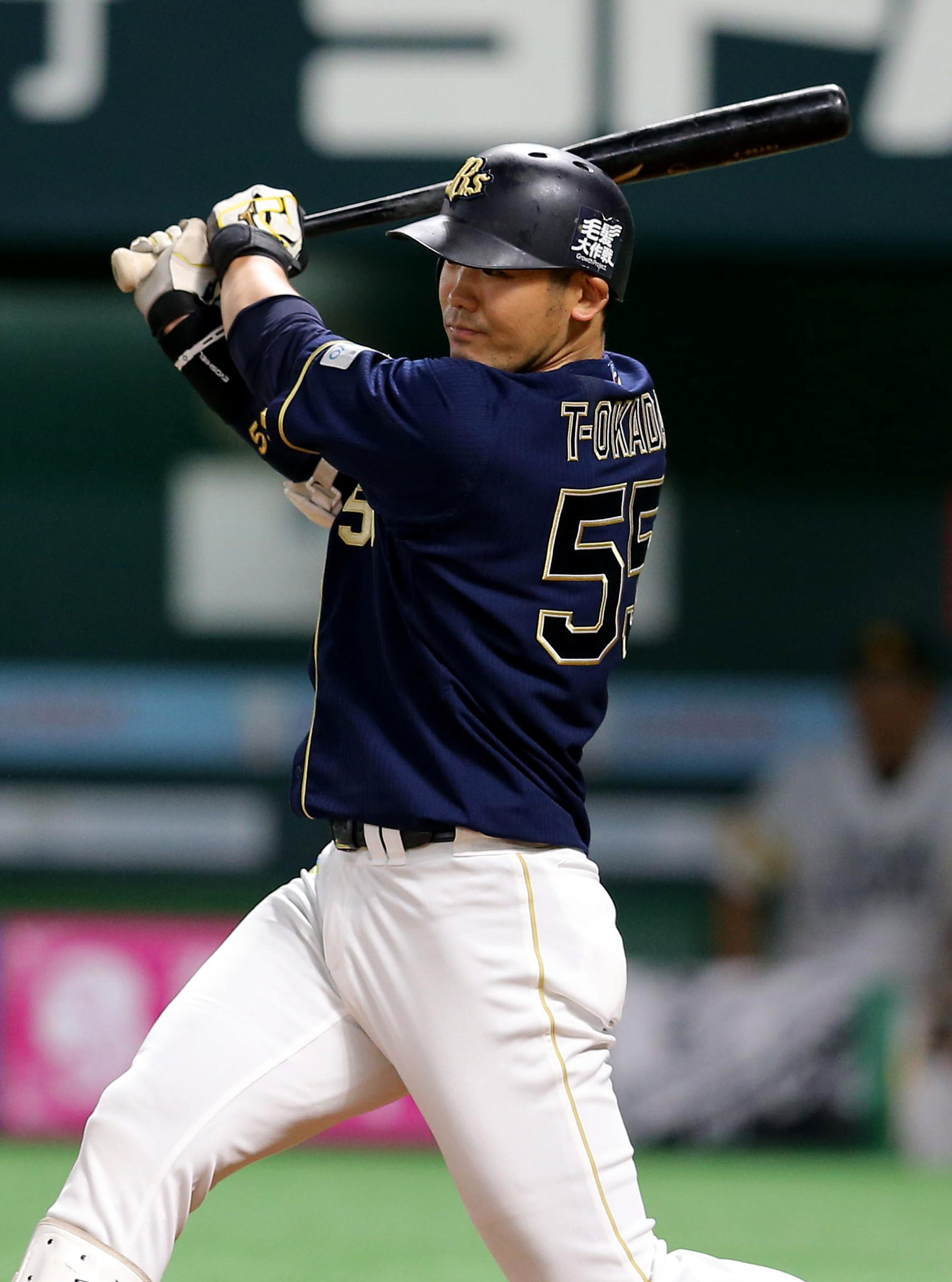 4番 T-岡田 四球 フォアボールを選ぶ 1,2塁 |