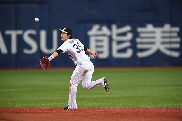 西野選手は二遊間の打球を好捕しセカンドでアウトを取る