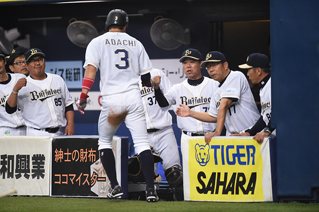 T-岡田選手の適時打で生還した安達選手