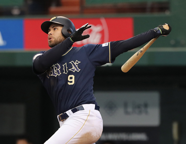 投手 シュリッター 5番 T-岡田 中安 外角のツーシームをセンターへ打ってヒット 1塁 |