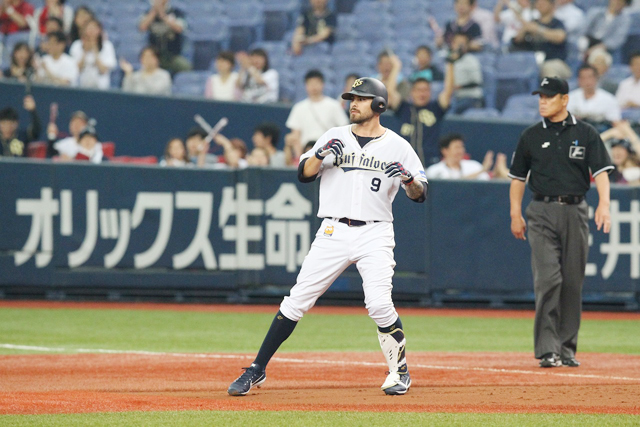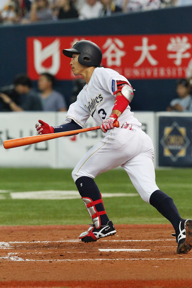この回の逆転劇につながるヒットで出塁した小谷野選手!