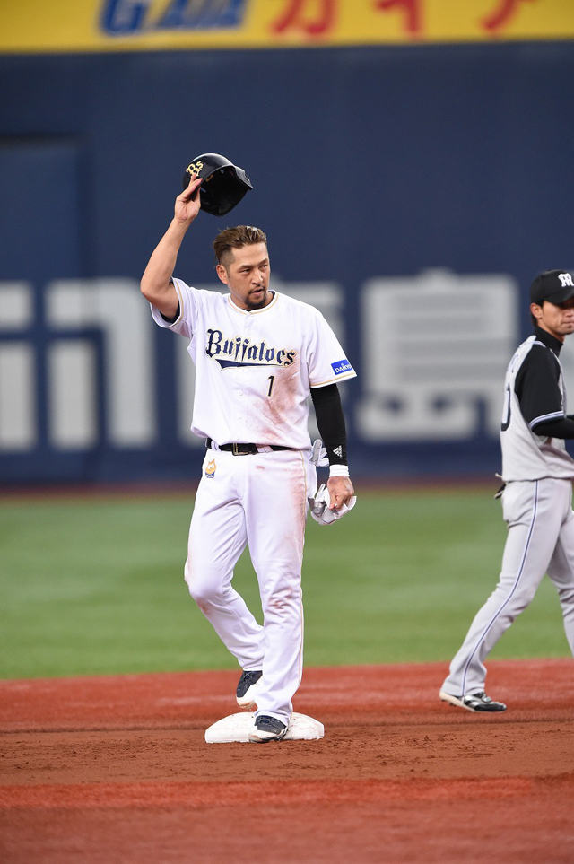 節目となる通算300本目の二塁打を放ち、ファンへ挨拶する中島選手!