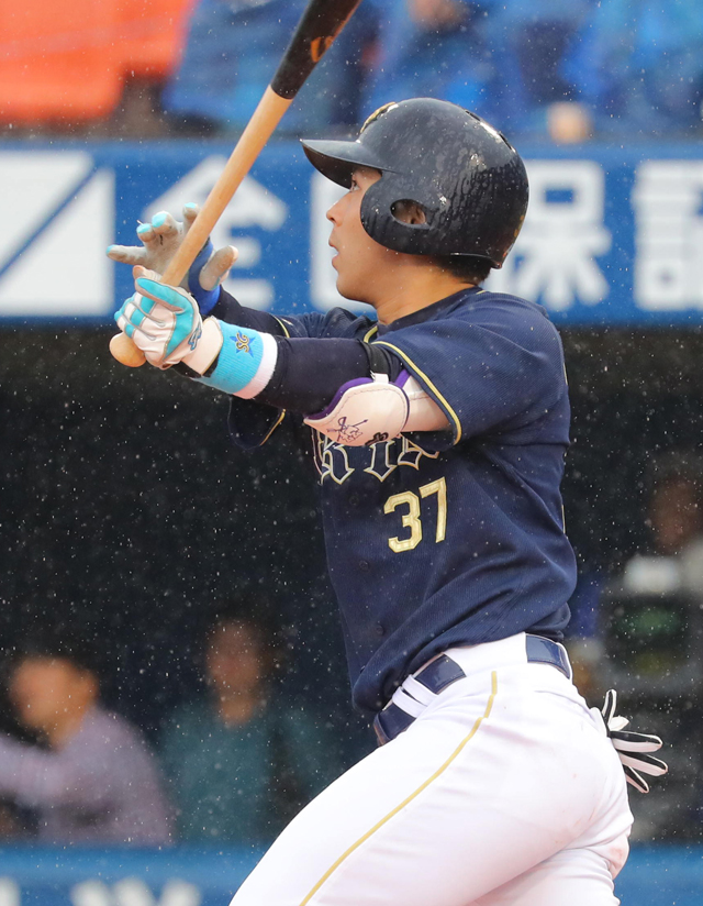 フェンスダイレクトの2点タイムリー2ベースヒットを放った若月選手